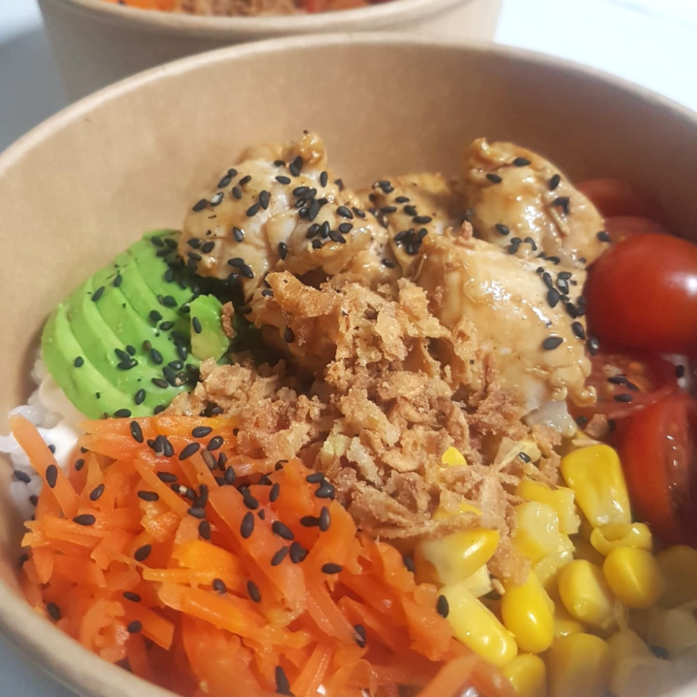 - Poke bowl de arroz, pollo crujiente, zanahoria, maíz, remolacha, aguacate & mahonesa de sriracha
