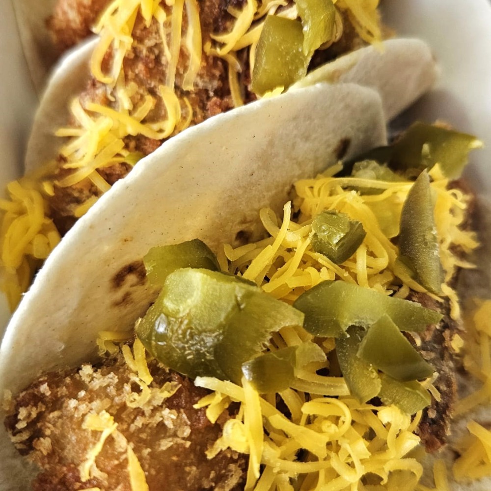 - Tacos mexicanos de merluza crujiente & pico de gallo con nachos & salsa cheddar