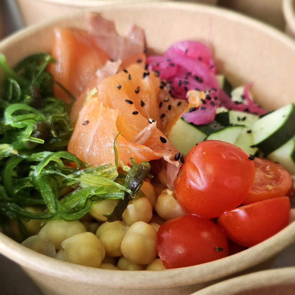 Poke Bowl de arroz, salmón ahumado, alga wakame, zanahoria, maíz, rabanitos, cebolla crunchy & mahonesa sriracha.