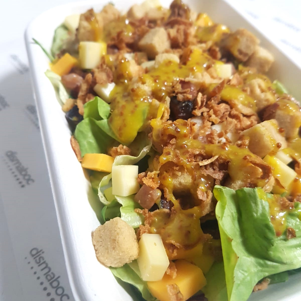 - Ensalada New Yorker con bacon, queso cheddar, queso edam, picatostes, cebolla crunchy, lechuga variada & vinagreta de mostaza & miel (Salsa aparte)