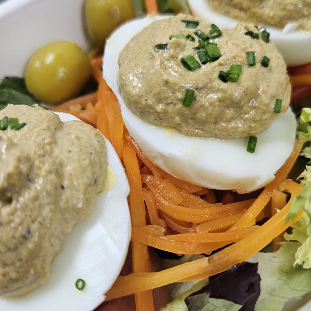 - Huevos rellenos de paté de mejillones con ensalada mixta