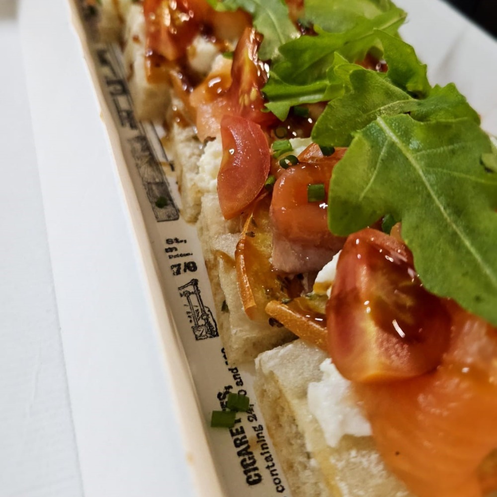 - Coca Mallorquina caprese con mozzarella fresca, tomate, almendras, rúcula & pesto