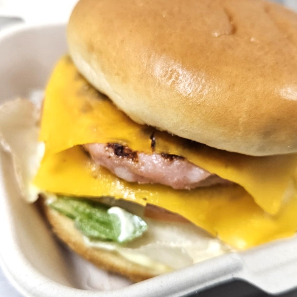 - Hamburguesa de pollo con queso brie, cebolla caramelizada, rúcula & salsa mostaza & miel en Pan Brioche.