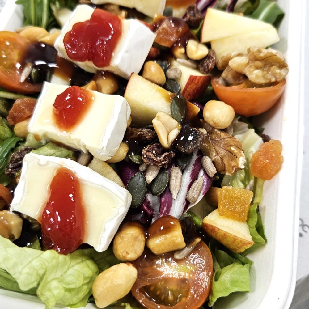 - Ensalada de queso brie frito, mermelada de tomate, frutos secos, tomate cherry, manzana, lechuga variada & crema de módena.