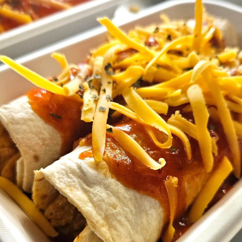 - Enchilada de pollo gratinadas con queso & arroz blanco con frijoles.