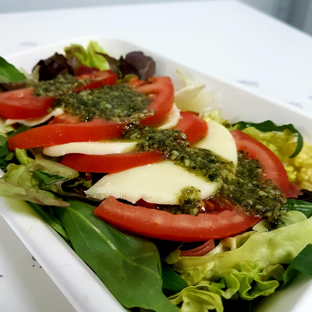 - Ensalada Capresse con burrata, tomate, jamón serrano, olivas negras, almendras, rúcula & lechuga variada con suave pesto
